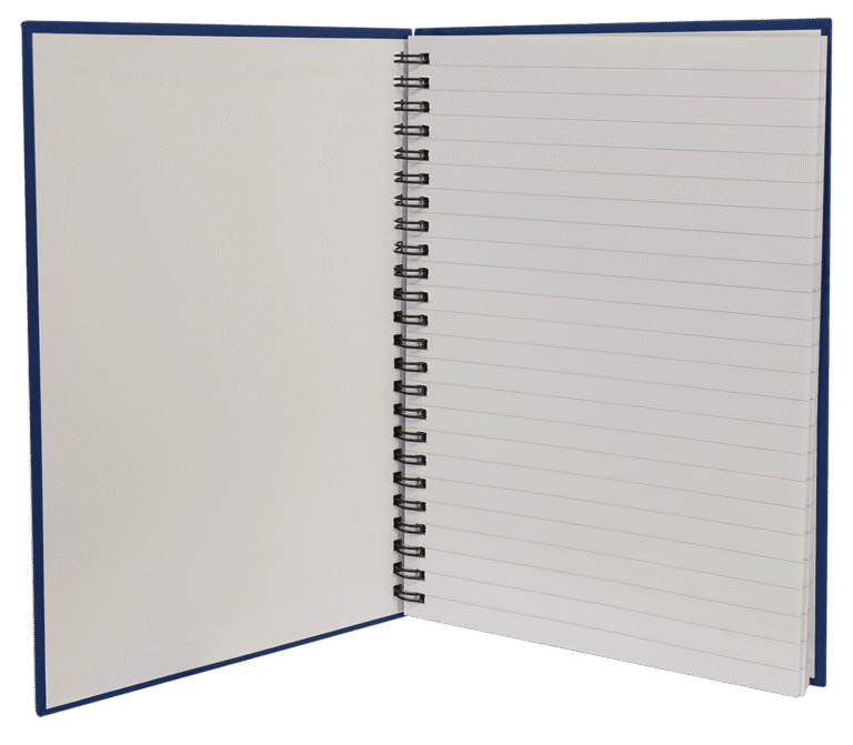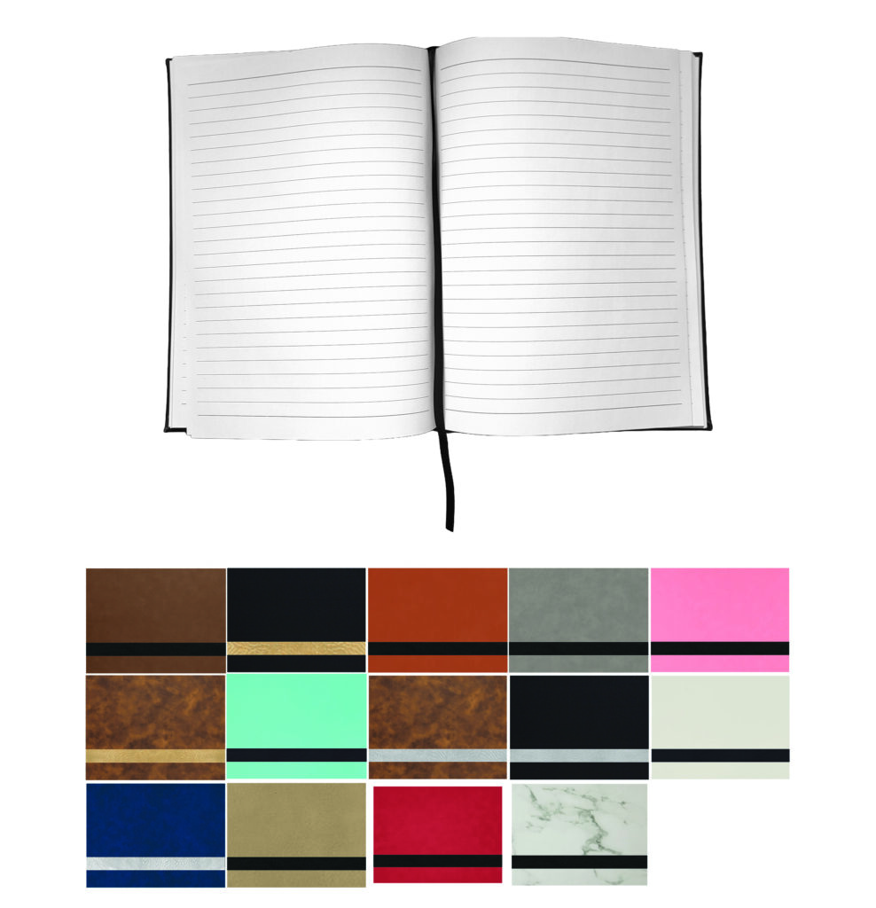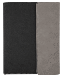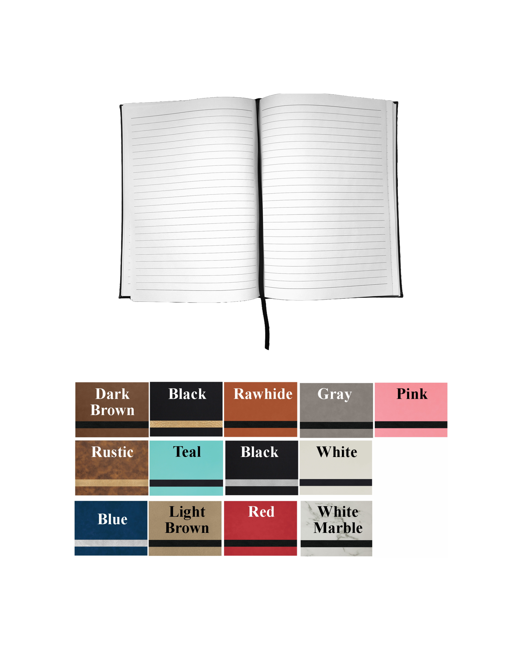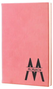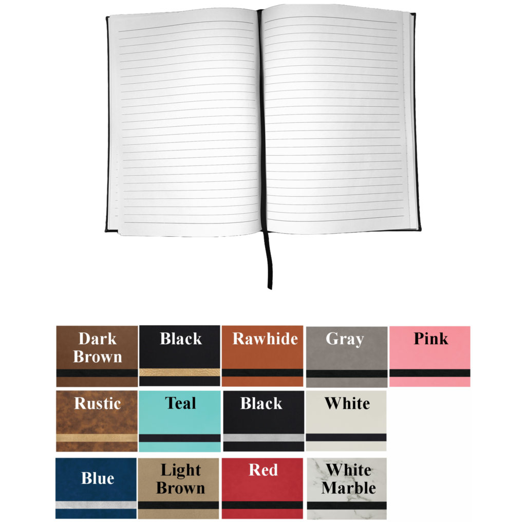 All items laser engrave. Lined notebook included with elastic band to hold pen.