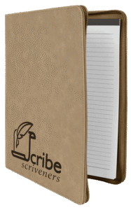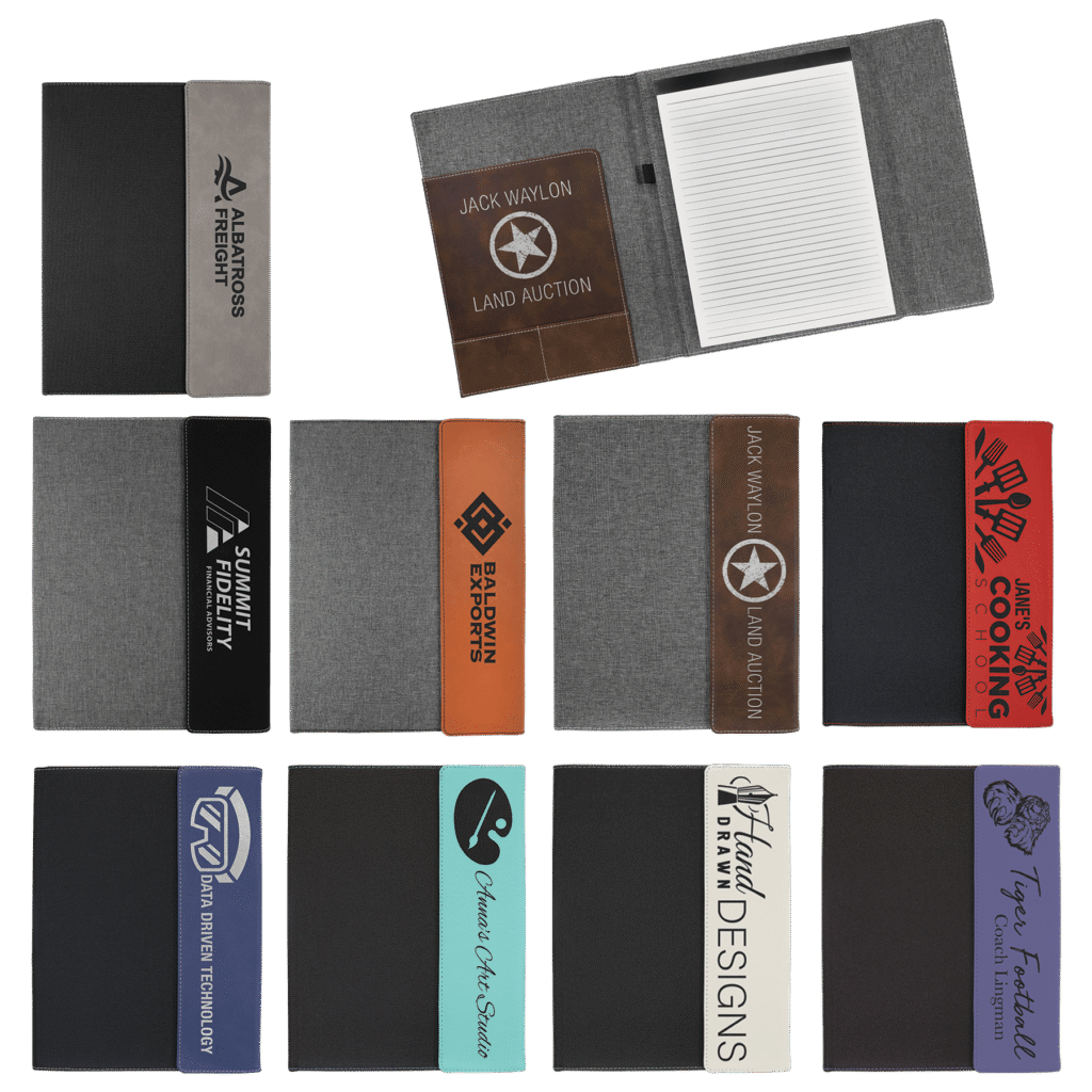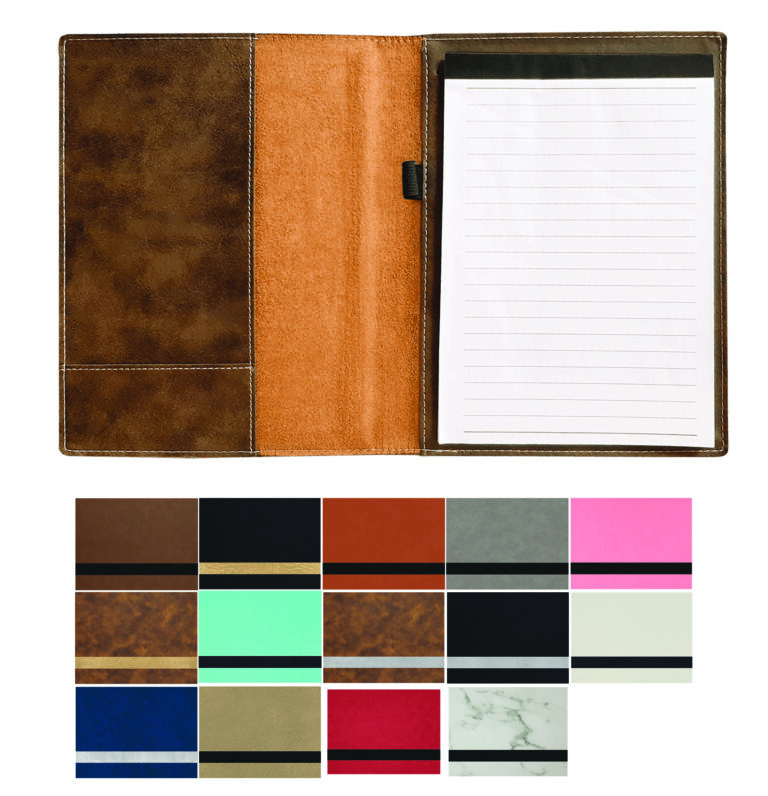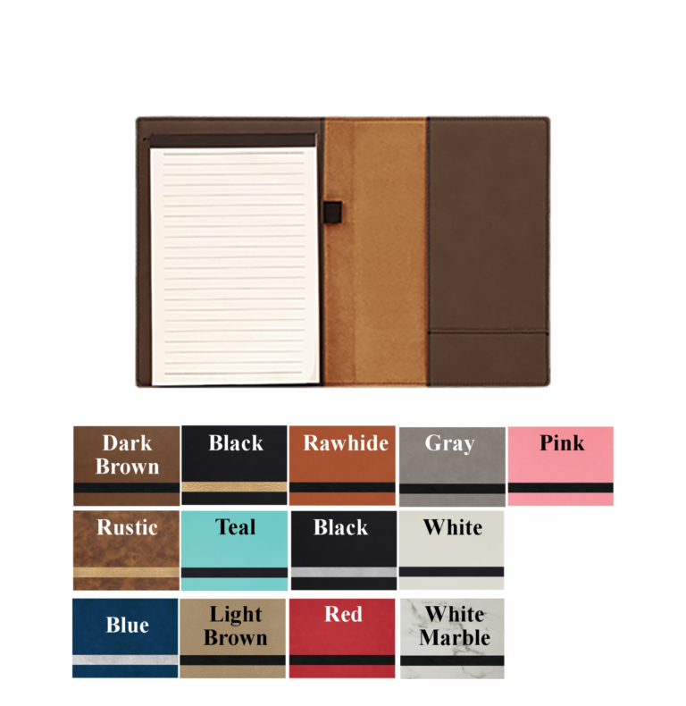 All items laser engrave. Lined notepad included with elastic band to hold pen.